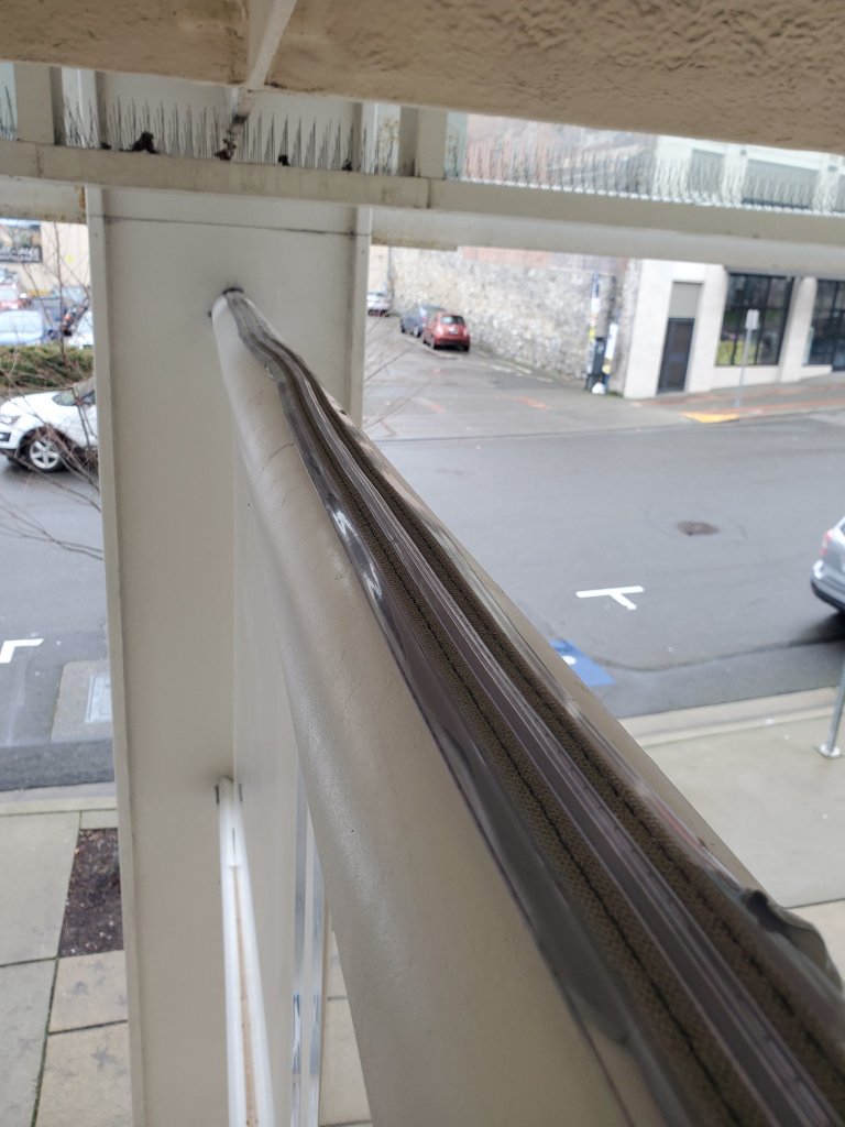 Today we are working on installing Bird-Jolt track to the tops of a client’s sign holders. Also, a few feet of spike to the overhang supports at a stairway. If you need birds excluded from an area of your building Tahoma Pest Management is your solution. Bird-Jolt is essentially an electric fence applied in the same manner as spikes, just better looking asthetically.